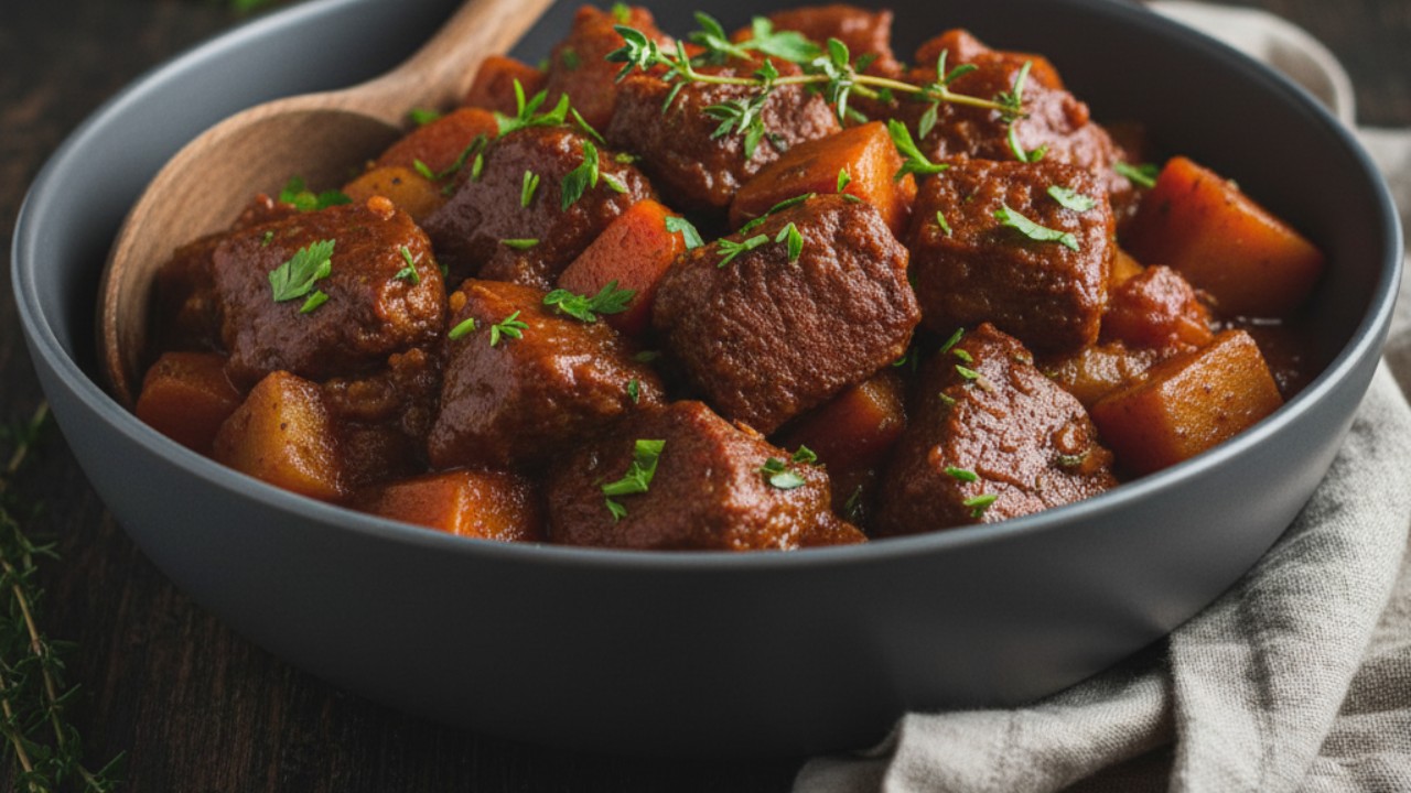- Cottura in Umido: Aggiungete la foglia di alloro e la salsa di soia, poi versate il brodo vegetale caldo a coprire. Portate a ebollizione, poi abbassate la fiamma al minimo, coprite e lasciate sobbollire. La cottura è terminata quando il liquido si sarà ritirato in una salsa densa che avvolge lo spezzatino, e l’olio avrà smesso di separarsi selvaggiamente dal fondo (circa 15 minuti).