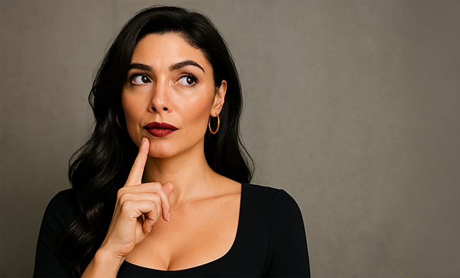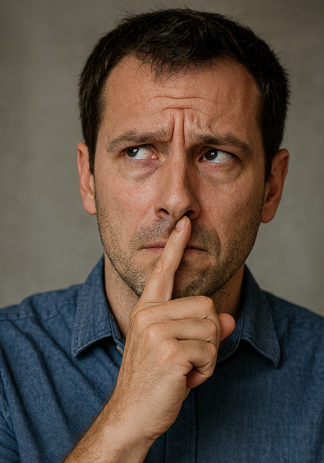 Questa immagine mostra un volto umano con segnali tipici della menzogna secondo la PNL e il linguaggio del corpo. L’espressione, lo sguardo deviato verso l’alto a sinistra, e il gesto della mano sul viso sono tutti indicatori comunemente associati a processi cognitivi legati all’invenzione o alla distorsione della verità.