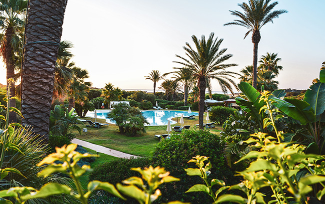 La stagione dei bagni, qui, si inoltra in un autunno mite e generoso, che accarezza rispettosamente la pelle con i raggi tiepidi di un sole gentile, lontano parente della feroce palla di fuoco che spadroneggia nei cieli estivi a caccia di bruciature. Che sia il momento migliore per conquistare pacificamente questo angolo di Sardegna a meno di un’ora da Cagliari ma ad anni luce dalla chiassosa mondanità del profilo più appariscente dell’isola, lo si capisce lungo il percorso che, attraverso la riserva Spartivento, dove i fenicotteri spiccano il volo, porta alla “spiaggia dell’acqua dolce”. È un’atmosfera letteralmente paradisiaca. Appoggiando l’orecchio a terra, si ha la sensazione di percepire il battito della natura, il respiro del mare, il suono autentico di una regione che si riflette nelle scelte architettoniche e di design di camere e suite, in alcuni casi dotate di giardino privato o terrazze con vista sul mare.