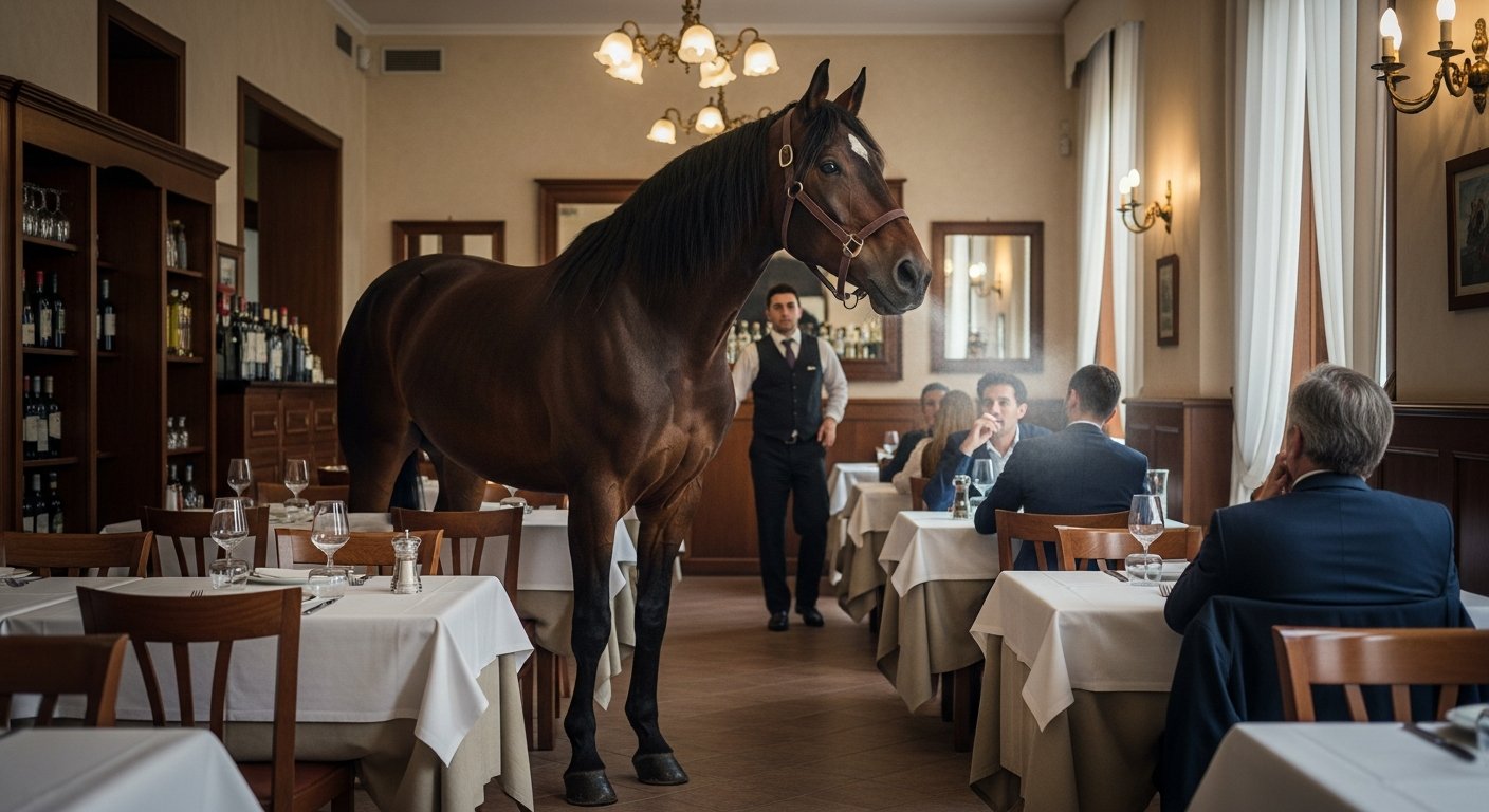 Ettore, il cavallo, non sembrava aggressivo. Sembrava solo terribilmente, biblicamente, fuori luogo. Le sue narici si dilatavano, aspirando l’aroma potente del sugo di cinghiale che arrivava dalla cucina. Si muoveva con la grazia pesante di una statua che avesse deciso di fare due passi, scansando con un impercettibile movimento della testa la pianta di ficus all’ingresso, ma non riuscendo a evitare il tavolino delle tartine.